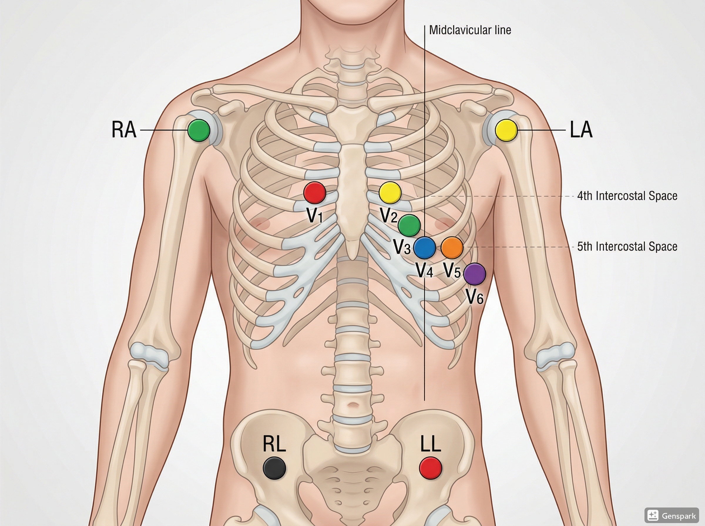 Incorrect placement can significantly alter the ECG appearance. For example, placing V1 and V2 too high can create misleading patterns and can mimic pathology. That is why learning lead placement is not just a technical issue; it is part of interpretation.