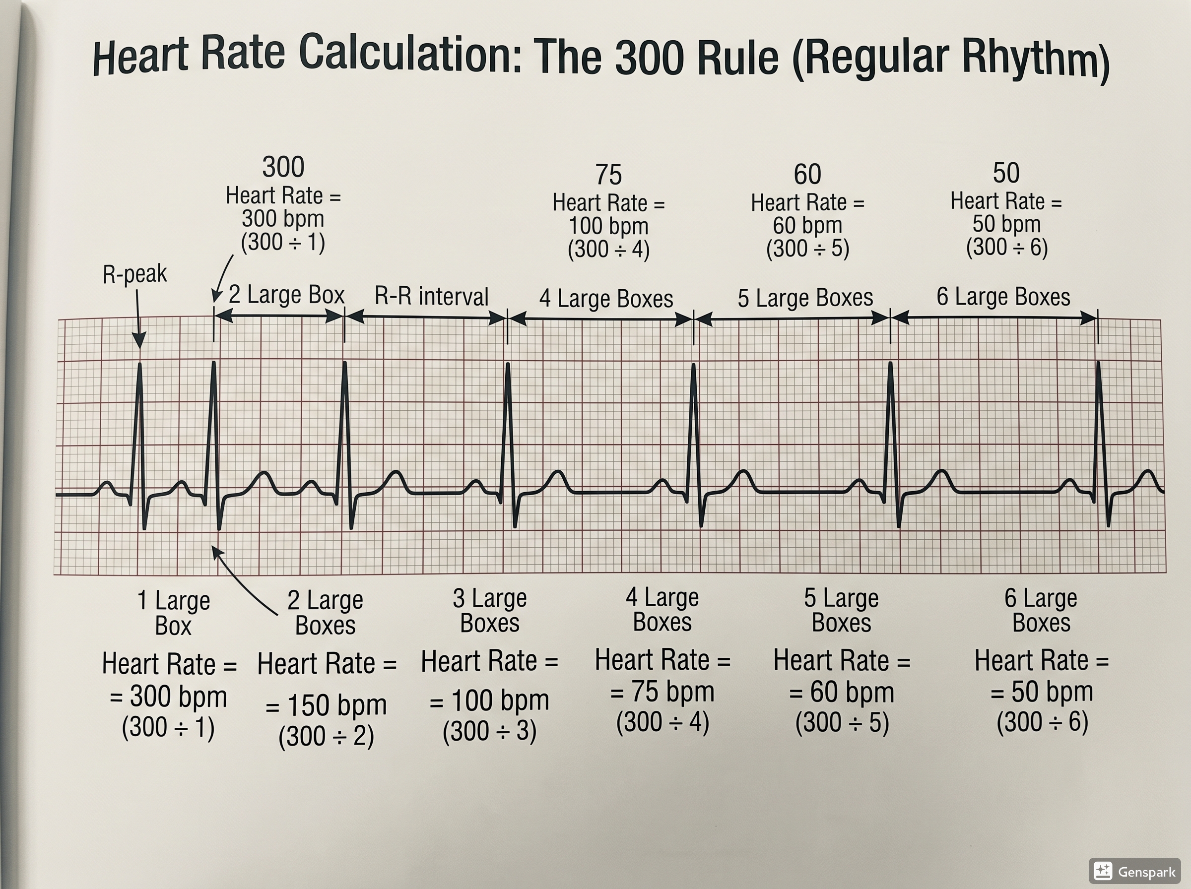 The 300 rule is a quick bedside method for regular rhythms. Heart rate equals 300 divided by the number of large squares between R waves.