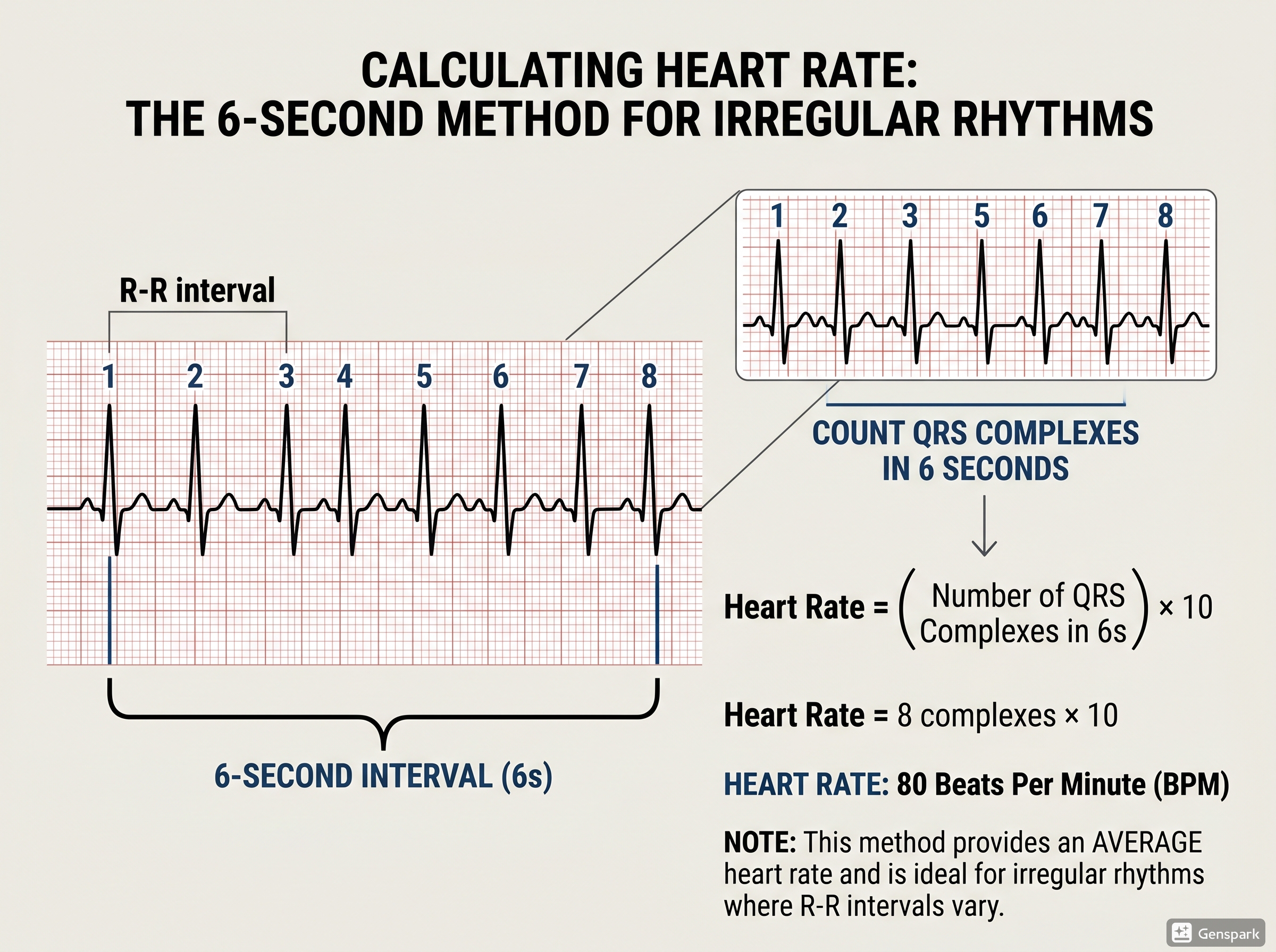 When the rhythm is irregular, the safest quick method is to calculate the average heart rate over a longer strip. On a standard 10-second rhythm strip, count the number of QRS complexes and multiply by 6. Some teaching resources also describe a 6-second strip method and multiply by 10. The principle is the same: count beats over a known time and convert to beats per minute.