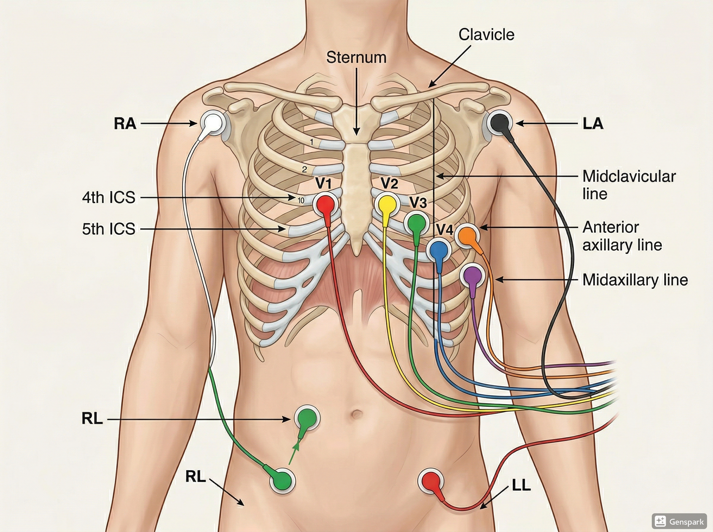 Although we call it a 12-lead ECG, it does not mean 12 separate wires are attached to the patient. The standard setup uses limb electrodes and chest electrodes to generate these 12 perspectives.